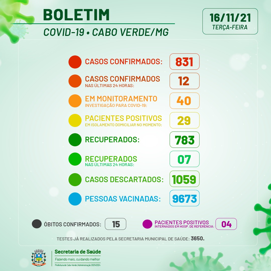 Cabo Verde já soma 831 casos positivos, 783 pacientes recuperados e 15 óbitos. No momento, 04 pacientes estão internados em hospital de referência, 40 estão em isolamento e 29 pacientes positivos em isolamento domiciliar. Por fim, 07 pacientes foram declarados recuperados nas últimas 24 horas.