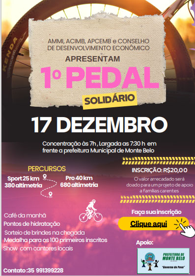 Vai acontecer no domingo, dia 17 de dezembro de 2023, o 1º Pedal Solidário de Monte Belo/MG. O evento é uma das ações comemorativas dos 85 anos de emancipação político-administrativa do município.