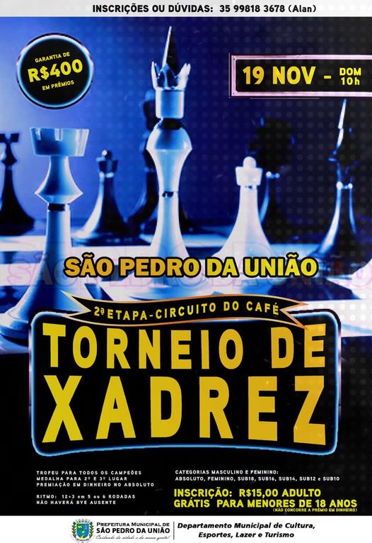 A Prefeitura de São Pedro da União, por meio do Departamento Municipal de Cultura, Esporte, Lazer e Turismo, promove a 2ª Etapa do Torneio de Xadrez Circuito do Café.