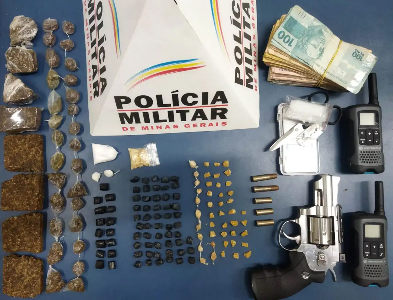 A PM foi até a residência do adolescente onde a avó foi informada dos fatos e autorizou a equipe a verificar o quarto e pertences do adolescente. No interior de uma bolsa, foram localizados uma réplica de revólver; dois rádios comunicadores com base; uma balança de precisão; quatro tabletes e 18 buchas de substância semelhante a “maconha”; uma porção maior e 35 pedras fracionadas de substância semelhante a “crack”; uma porção maior e 15 papelotes contendo pó branco semelhante a “cocaína” e materiais utilizados para embalar drogas. No local, também foi localizada uma bolsa azul contendo alguns aparelhos celulares, uma chave de veículo “Citroen”, documentos e vários cartões.