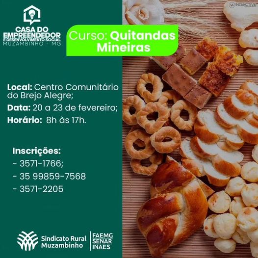 Estão abertas as inscrições para o curso de QUITANDAS MINEIRAS, a ser ministrado e certificado pelo SENAR, através do Sindicato dos Produtores Rurais de Muzambinho, em parceria com a Casa do Empreendedor e Desenvolvimento Social.
