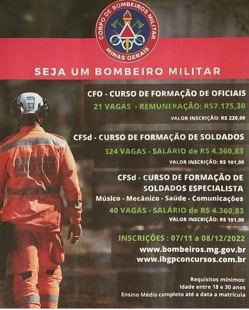 Todas as informações como idade, escolaridade, locais de provas, como se inscrever, encontram-se no edital publicado no site do CBMMG (https://www.bombeiros.mg.gov.br) na aba “concursos”.