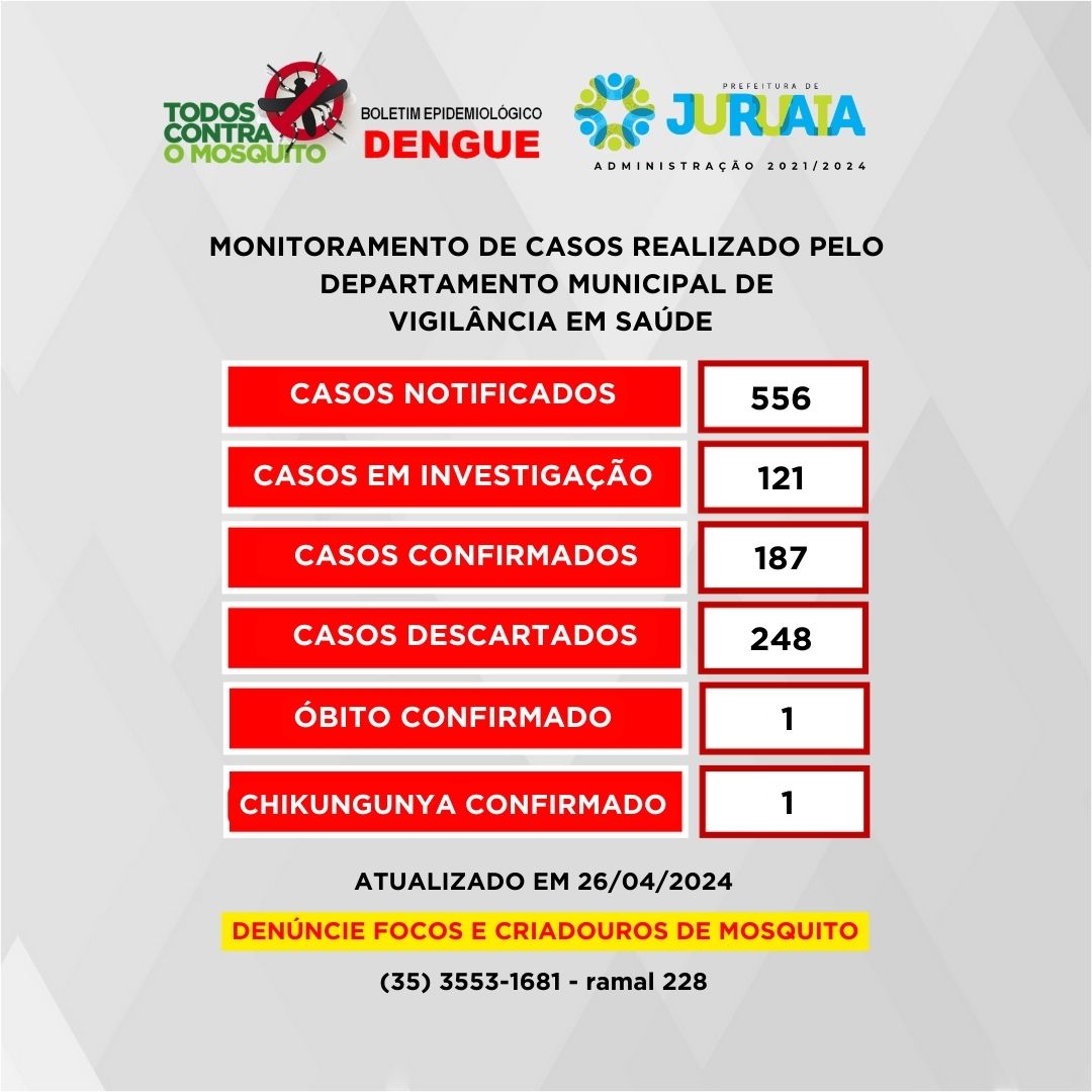 Confira o boletim epidemiológico do período de 01/01/2024 a 26/04/2024.
