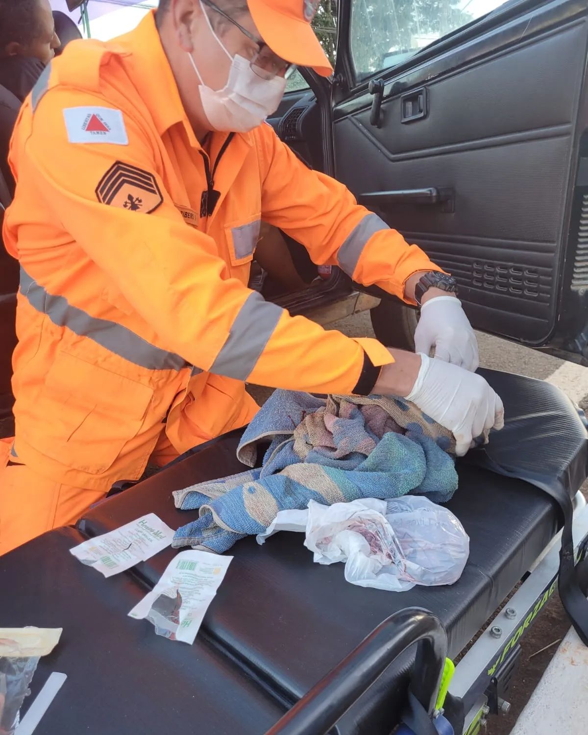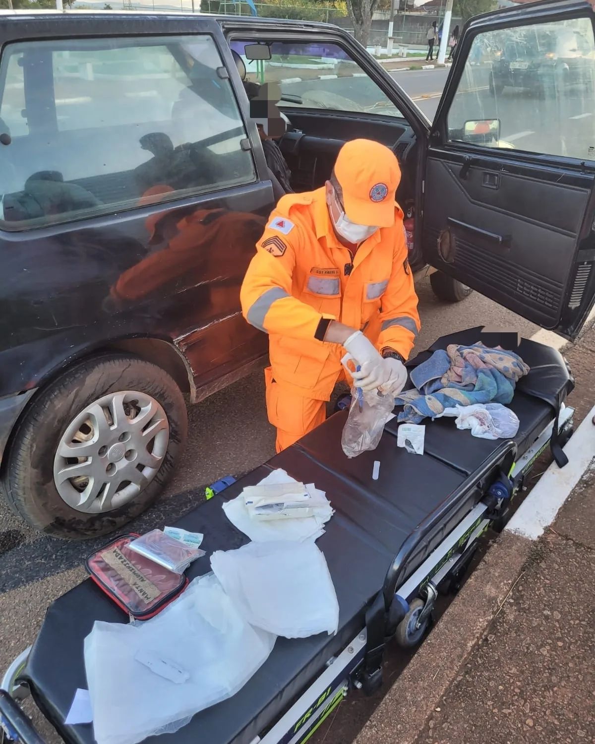 No local, os bombeiros foram informados que a bolsa amniótica da gestante havia se rompido e um vizinho a havia socorrido e levado ao pronto-socorro. Após colher as características do veículo, os bombeiros saíram em busca do carro que a transportava para auxiliar caso não desse tempo de chegar ao pronto-socorro.
