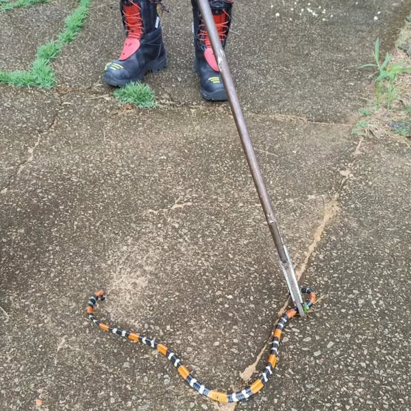 Uma cobra coral (Micrurus Carvalhoi) de aproximadamente 80 cm foi resgatada esta manhã pelo Corpo de Bombeiros no bairro Ouro Verde em Guaxupé em frente a garagem da solicitante.
