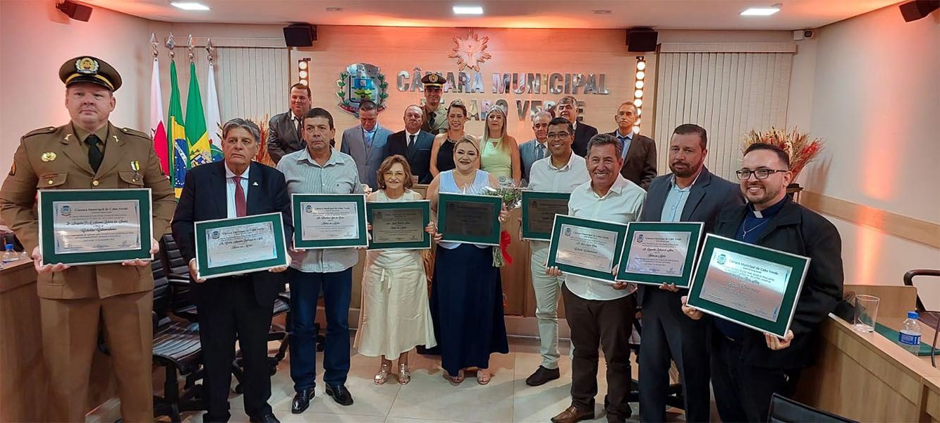 Na noite da segunda-feira (15), o poder Legislativo de Cabo Verde, sob a presidência da vereadora Maísa Renata Batista Gianini, realizou Sessão Solene para a entrega das honrarias Título de Cidadania Honorária e Placas de Honra ao Mérito. O momento foi prestigiado por familiares e populares. Também pelo prefeito Cláudio Antônio Palma e vice-prefeito Marcelo Batista Figueiredo.