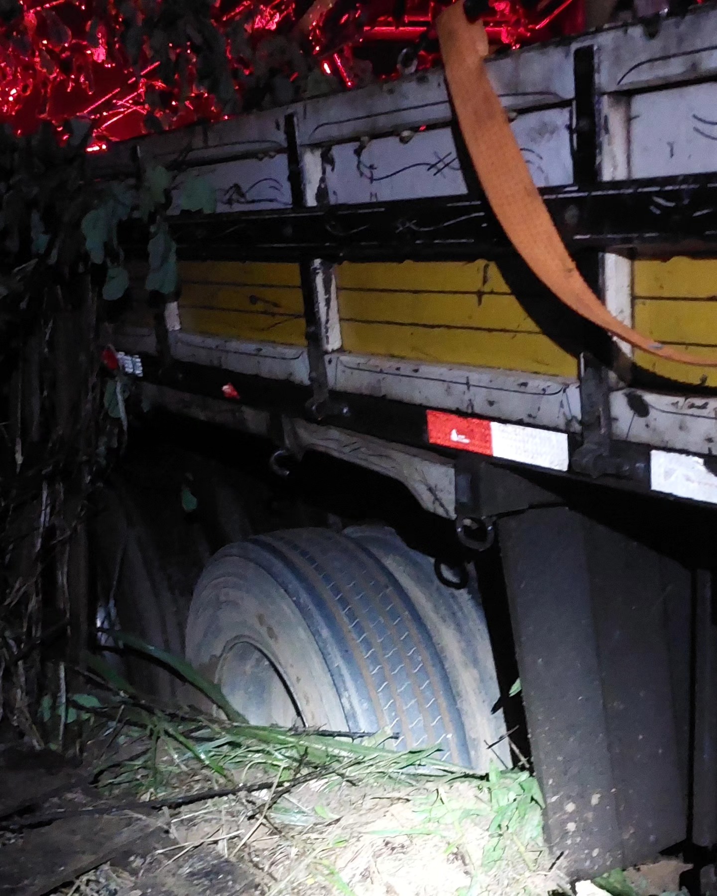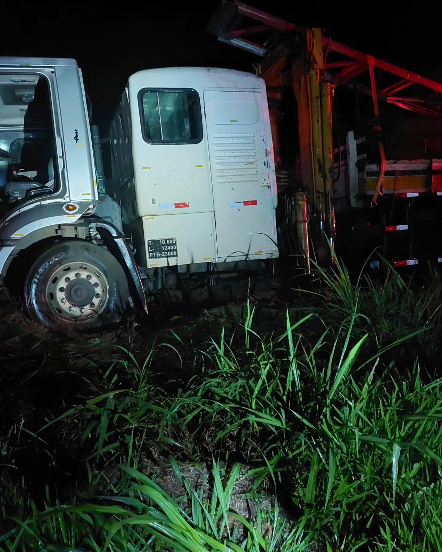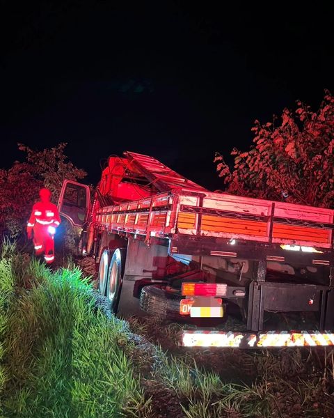 No local, no entanto, foi constatado que o caminhão apenas havia saído da pista de rolamento após o condutor perder o controle direcional do veículo, provavelmente em decorrência da forte chuva que caia no momento.