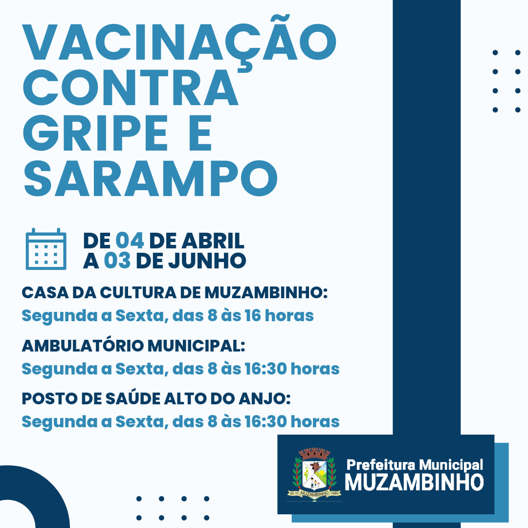 A Prefeitura Municipal de Muzambinho, por meio da Secretaria de Saúde, informa que a Campanha de Vacinação contra a Gripe e o Sarampo acontecerá no período de 04 de Abril a 03 de Junho, sendo que o Sábado (30/04) será o dia “D” da Campanha.