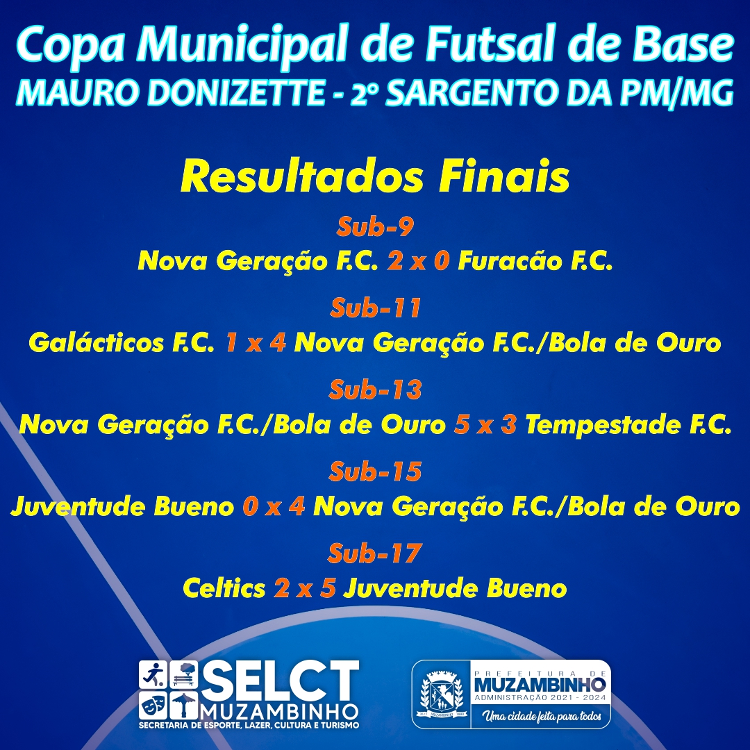 Na sexta-feira (10) e sábado (11) foram disputadas as finais da Copa Municipal de Futsal de Base 2023, com jogos na Praça de Esportes de Muzambinho. Na sexta-feira foi realizada a final do sub-13 e no sábado as finais do sub 09 / 11 / 15 e 17.