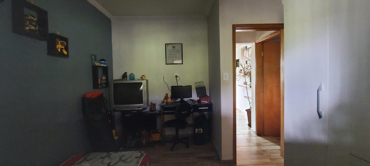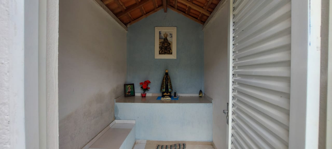 Todo terreno da casa é murado, com espaço para crianças e área coberta para veículos.