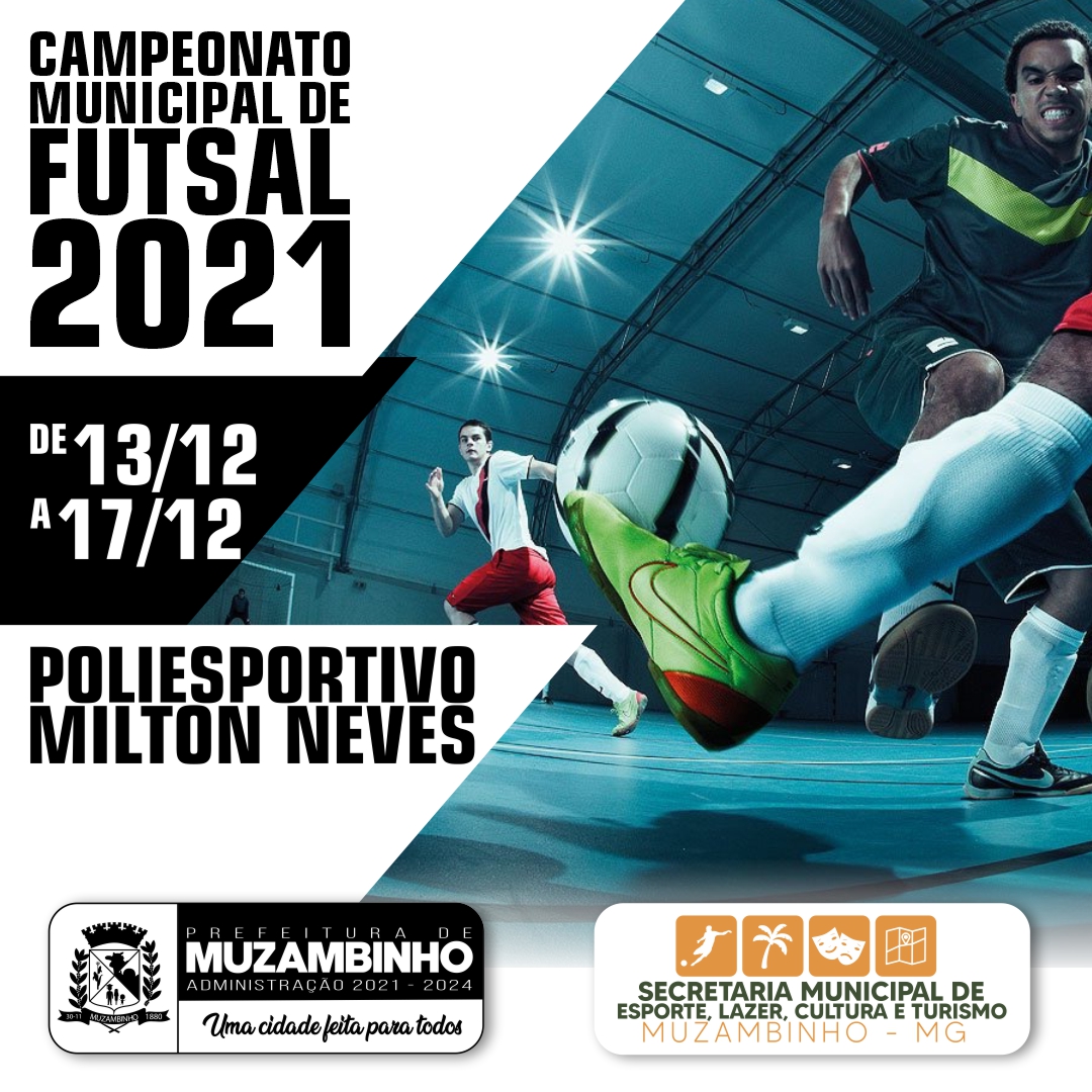 O Campeonato Municipal de Futsal 2021 em Muzambinho acontece entre os dias 13 e 17, no masculino e feminino. Os jogos acontecem no ginásio poliesportivo Milton Neves, a partir das 19 horas. A realização é da Secretaria Municipal de Esportes, sob a liderança do Secretário Wilsinho Lima.