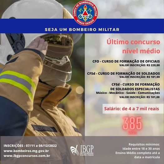 Último concurso nível médio. Estão abertos os concursos para o Corpo de Bombeiros Militar de Minas Gerais de nível médio para as carreiras de oficial, soldados combatentes e soldados especialistas. São 385 vagas ao total, com salários de R$ 7.175,30 para oficiais e de R$ 4.360,83 para soldados combatentes e especialistas.