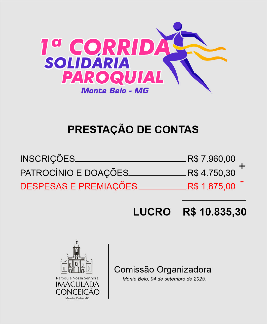 Mais do que celebrar a prática esportiva, a corrida teve um objetivo especial: arrecadar fundos para a reforma da Igreja Matriz Imaculada Conceição. Após o levantamento dos valores das inscrições, patrocínio e doações, já descontadas as despesas de organização e premiações, o evento alcançou um lucro de R$ 10.835,30.
