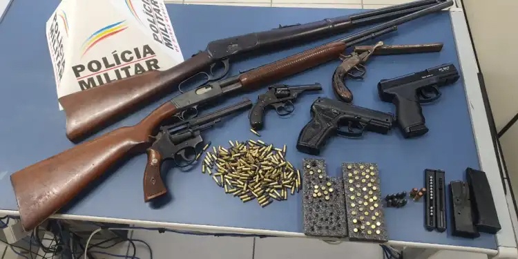 Os policiais foram até a casa e localizaram uma carabina da marca Remington de calibre 22, uma carabina da marca Rossi de calibre 38, um revólver da marca Smith e wesson calibre 22, um revólver da mesma marca, mas de calibre 32, uma garrucha sem marca, de cabo de madeira pintado de preto, uma pistola imitação da marca Taurus de pressão, calibre 5,5 milímetros de cor preta, uma pistola de airsoft da marca Rossi de 6 milímetros, dois carregadores de airsoft de 9 milímetros, três munições de calibre 40, três carregadores da marca Rossi com oito munições de calibre 32, quatro munições deflagradas, cartuchos vazios, calibre 22, onze esferas de airsoft, além de 232 munições intactas, marca Cbc, calibre 32.