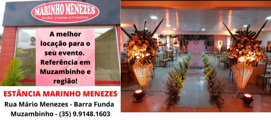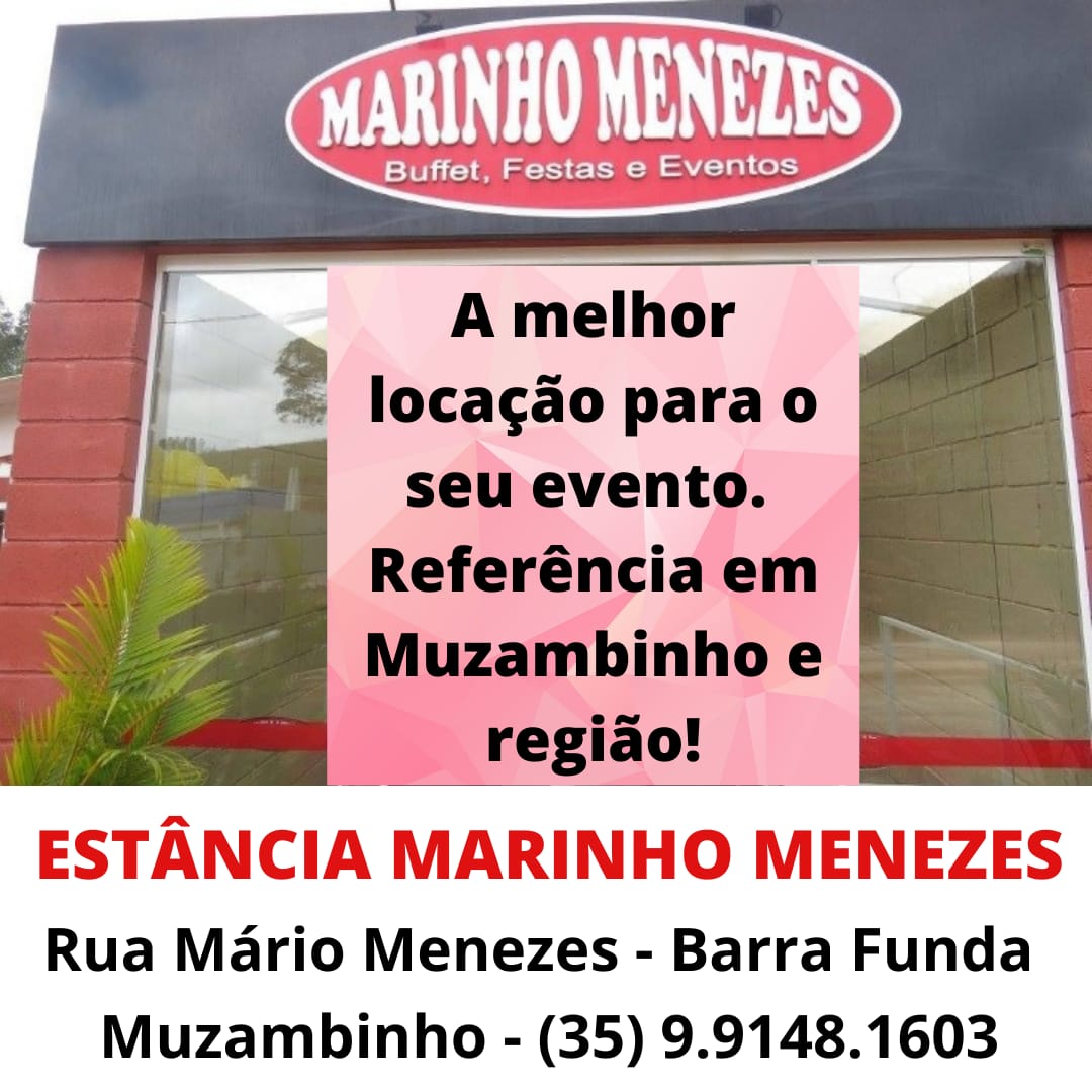 A Estância Marinho Menezes tem ótima localização, de fácil acesso e tráfego. Fica à Rua Mário Menezes, no bairro Barra Funda, dentro da cidade de Muzambinho. Não tem como errar! Conta com amplo estacionamento para 100 carros, áreas externas, área de lazer para as crianças, vários ambientes, palco, acústica, cozinha, sanitários, camarim, mesas, talheres, depósito e tudo necessário para a melhor organização do seu evento.