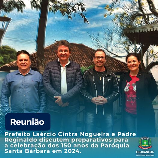 Na tarde da segunda-feira, 28, o prefeito Laércio Cintra se reuniu com o Padre Reginaldo Vieira Santos, Pároco da Igreja Matriz de Santa Bárbara de Guaranésia, juntamente com o Secretário de Cultura, Ismael da Silva Santos e a Diretora de Cultura, Cacilda Ribeiro.