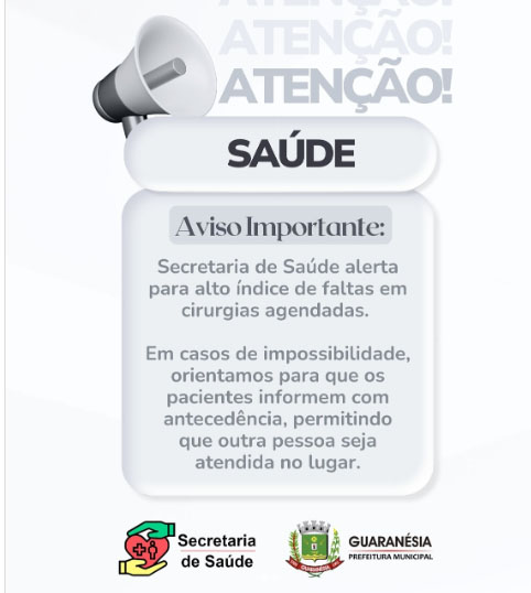 A Secretaria Municipal de Saúde de Guaranésia alerta para o alto índice de faltas em cirurgias de catarata realizadas na Santa Casa de Guaranésia. Na sexta-feira (14), das 40 cirurgias agendadas, 15 pacientes não compareceram, representando 37,5% de ausência. No sábado (15), de 40 procedimentos, 6 não foram realizados, totalizando 15% de faltas. No geral, das 80 cirurgias programadas para os dois dias, 21 não aconteceram, o que equivale a um índice preocupante de 26,25%.