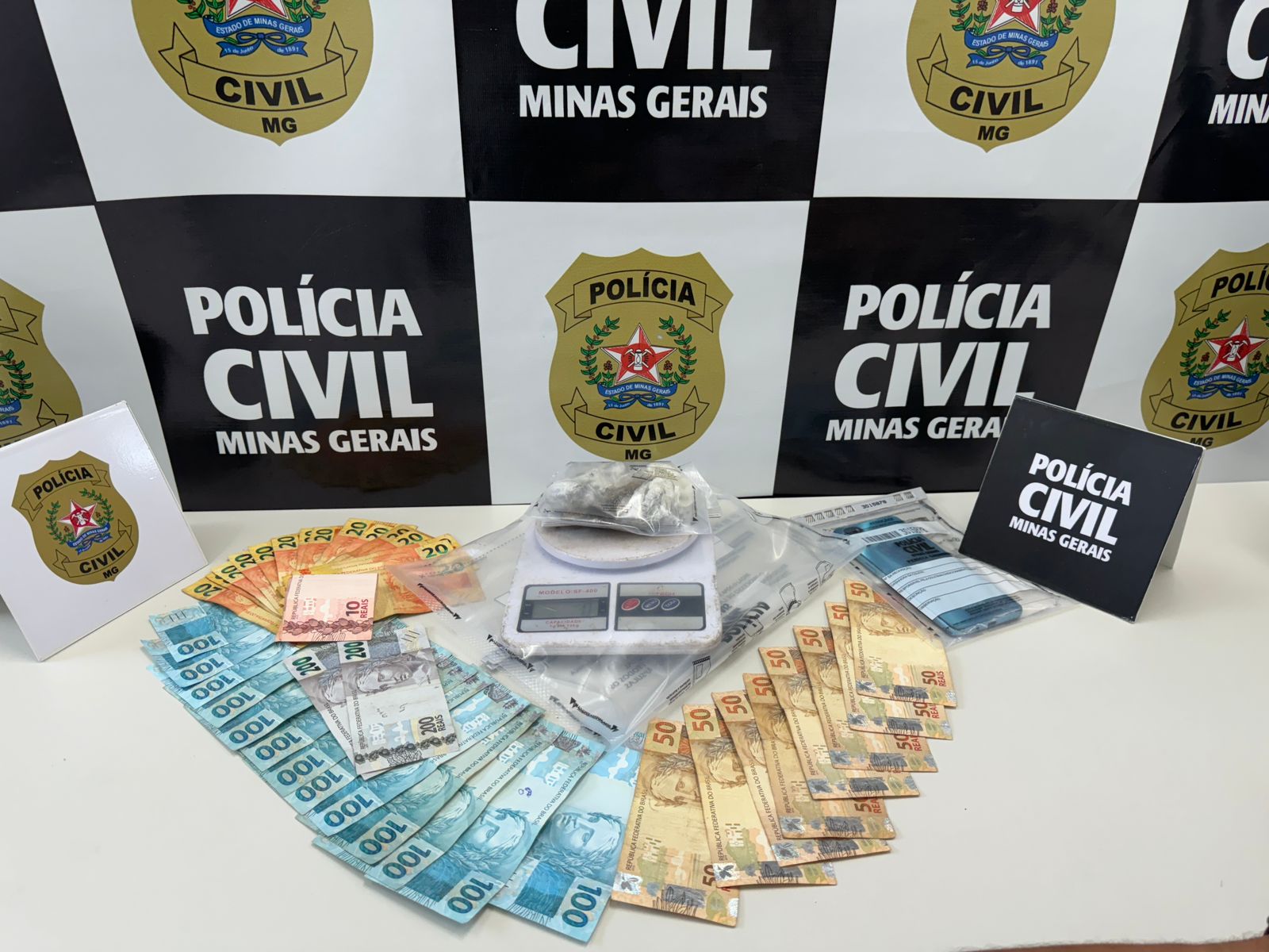 Durante a ação a equipe localizou no imóvel relevante quantidade de maconha em fração de tablete, uma balança de precisão e farto numerário de capital em espécie, o qual não soube a suspeita explicar sua origem.