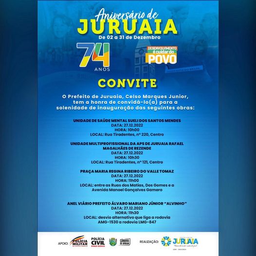 Para comemorar essa data tão especial, a Prefeitura de Juruaia entrega à comunidade importantes obras. Confira a programação: