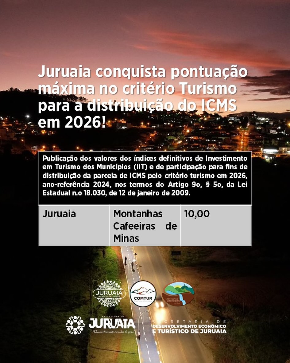Juruaia atingiu a pontuação máxima no critério Turismo para a distribuição do ICMS em 2026, consolidando-se mais uma vez como uma referência na gestão do setor em Minas Gerais.