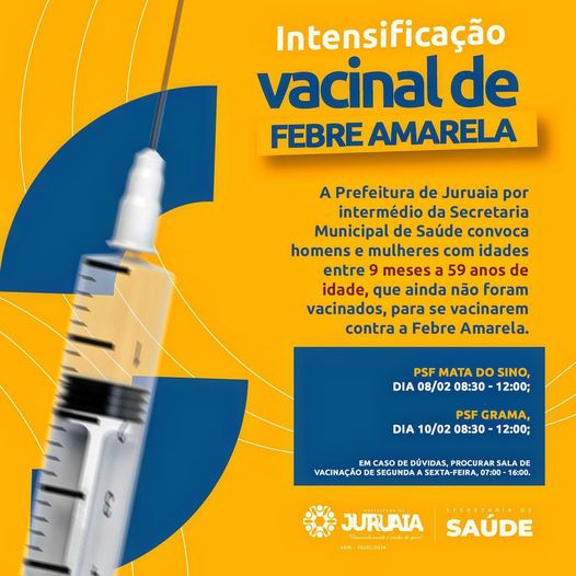 A Prefeitura de Juruaia, por intermédio da Secretaria Municipal de Saúde, convoca homens e mulheres com idades entre 9 meses a 59 anos de idade, que ainda não foram vacinados, para se vacinarem contra a Febre Amarela.