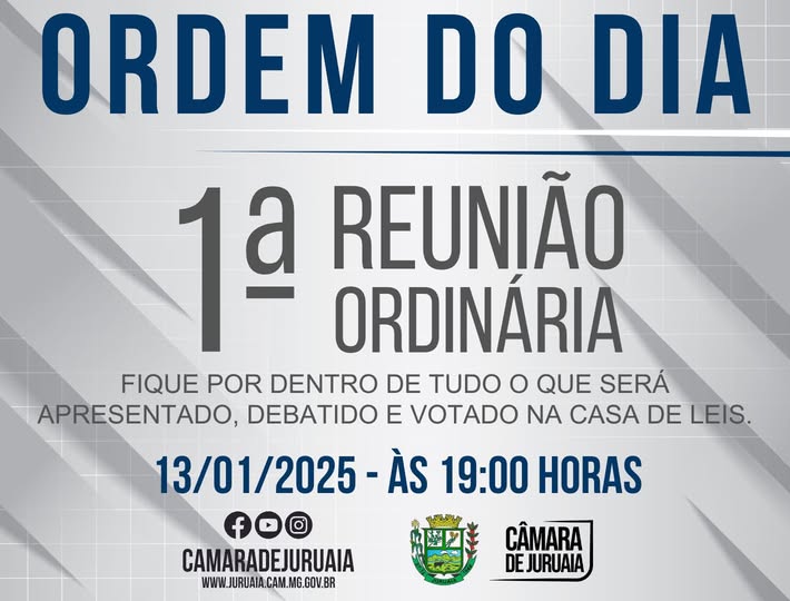 Confira todos os detalhes da pauta da Primeira Sessão Legislativa do Exercício de 2025 da Câmara Municipal de Juruaia nesta segunda-feira, 13 de janeiro, a partir das 19 horas.