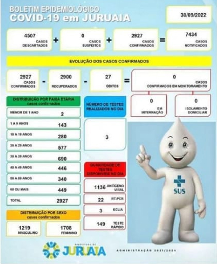Assim, Juruaia totaliza 2.927 casos positivos, sendo 2.900 recuperados/alta médica, com nenhum paciente em isolamento domiciliar, sem registro de pacientes em isolamento hospitalar e 27 óbitos confirmados COVID-19.