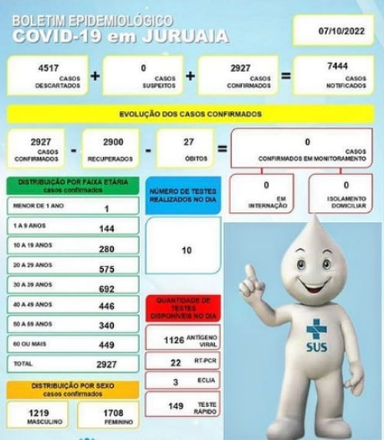 Assim, Juruaia totaliza 2.927 casos positivos, sendo 2.900 recuperados/alta médica, com nenhum paciente em isolamento domiciliar, sem registro de pacientes em isolamento hospitalar e 27 óbitos confirmados COVID-19.