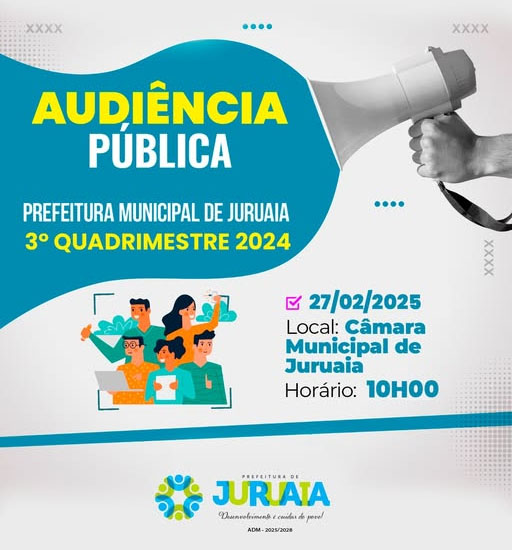 A Prefeitura de Juruaia convida toda a população para a Audiência Pública de prestação de contas do 3º quadrimestre de 2024.