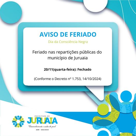 A Prefeitura de Juruaia informa que, conforme o Decreto municipal nº 1.753 de 14 de outubro de 2024, em conformidade com a Lei Federal nº 14.759 de 21 de dezembro de 2023, que declarou feriado nacional o dia 20 de Novembro como o Dia Nacional de Zumbi e da Consciência Negra, as repartições públicas do município de Juruaia estarão fechadas no próximo dia 20 de novembro.