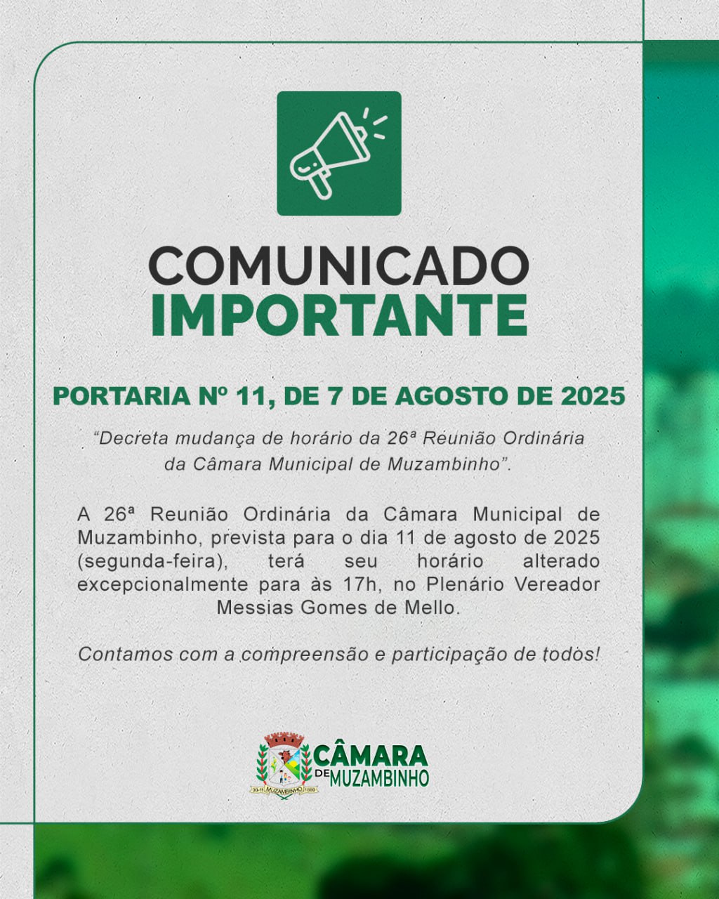 Conforme comunicado em anexo, a Portaria 11, de 7 de agosto de 2025, decretou a mudança do horário da 26ª Reunião Ordinária da Câmara de Muzambinho nesta segunda-feira, 11 de agosto. Com isso, a reunião vai acontecer excepcionalmente às 17 horas.