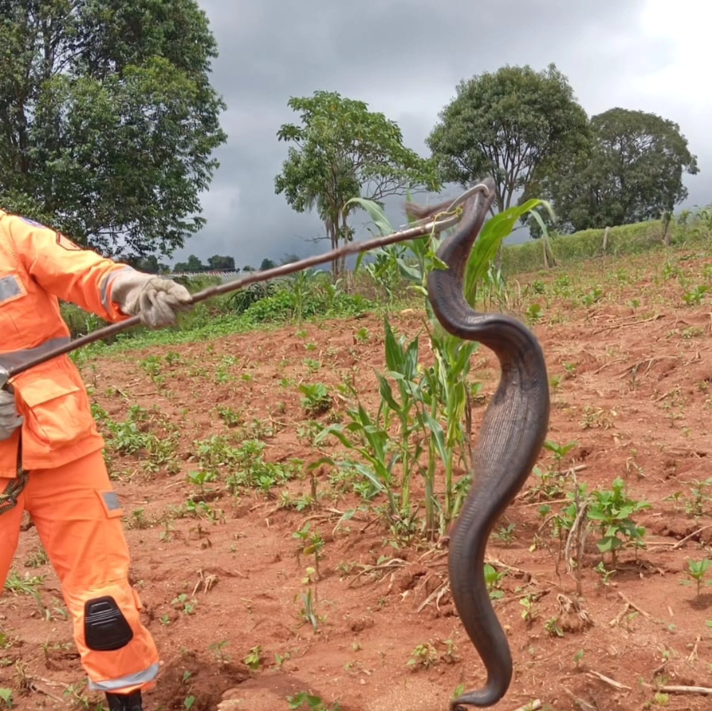 A cobra de grande porte estava em uma plantação de abóboras no quintal da residência do solicitante, próximo ao bairro Polo Industrial de Guaxupé (local chamado de “Cala Boca”).