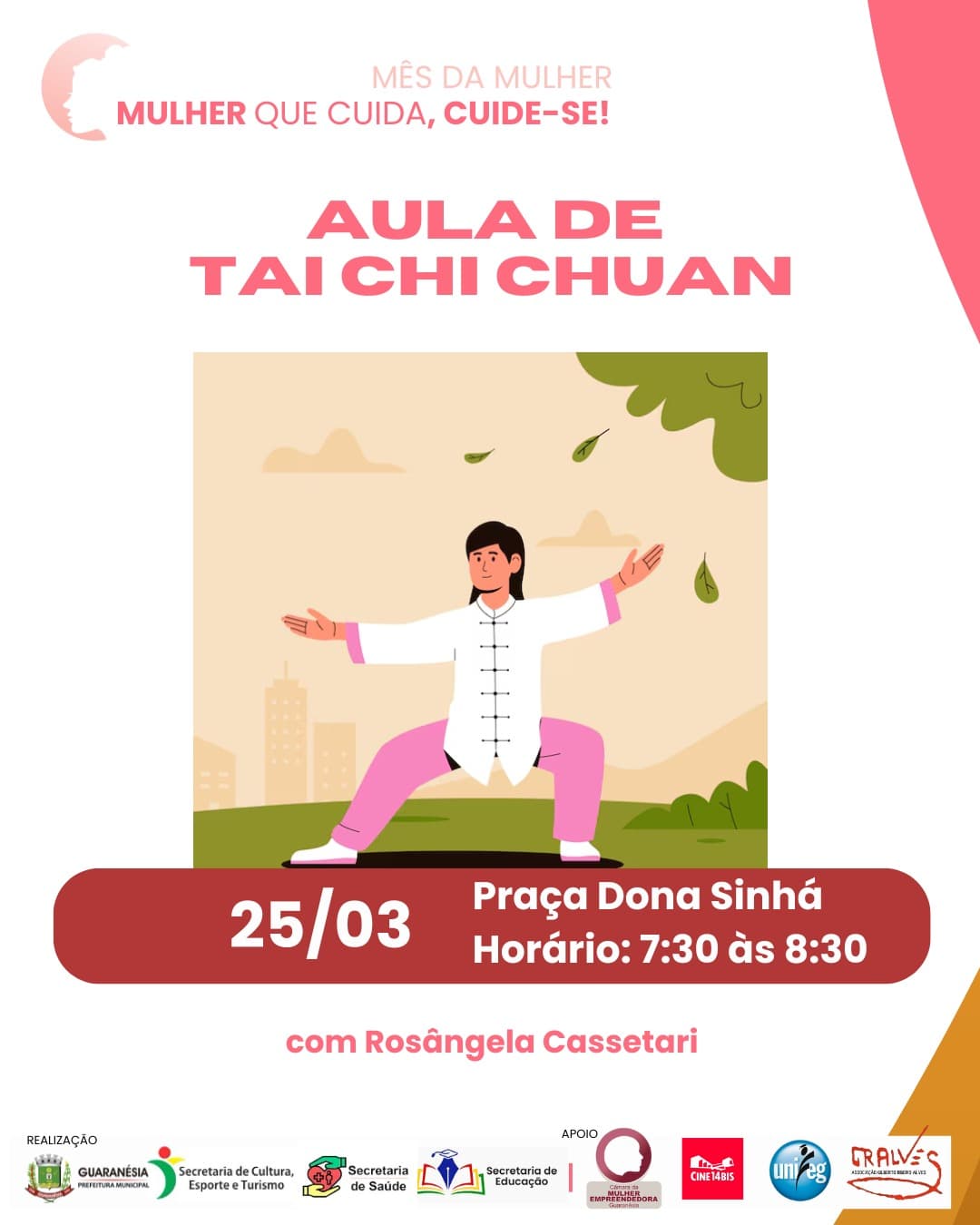 Como parte da programação especial do Mês da Mulher, a Prefeitura de Guaranésia convida a população para uma aula de Tai Chi Chuan, ministrada pela instrutora Rosângela Cassetari. A atividade acontecerá no dia 25 de março, das 7h30 às 8h30, na Praça Dona Sinhá.