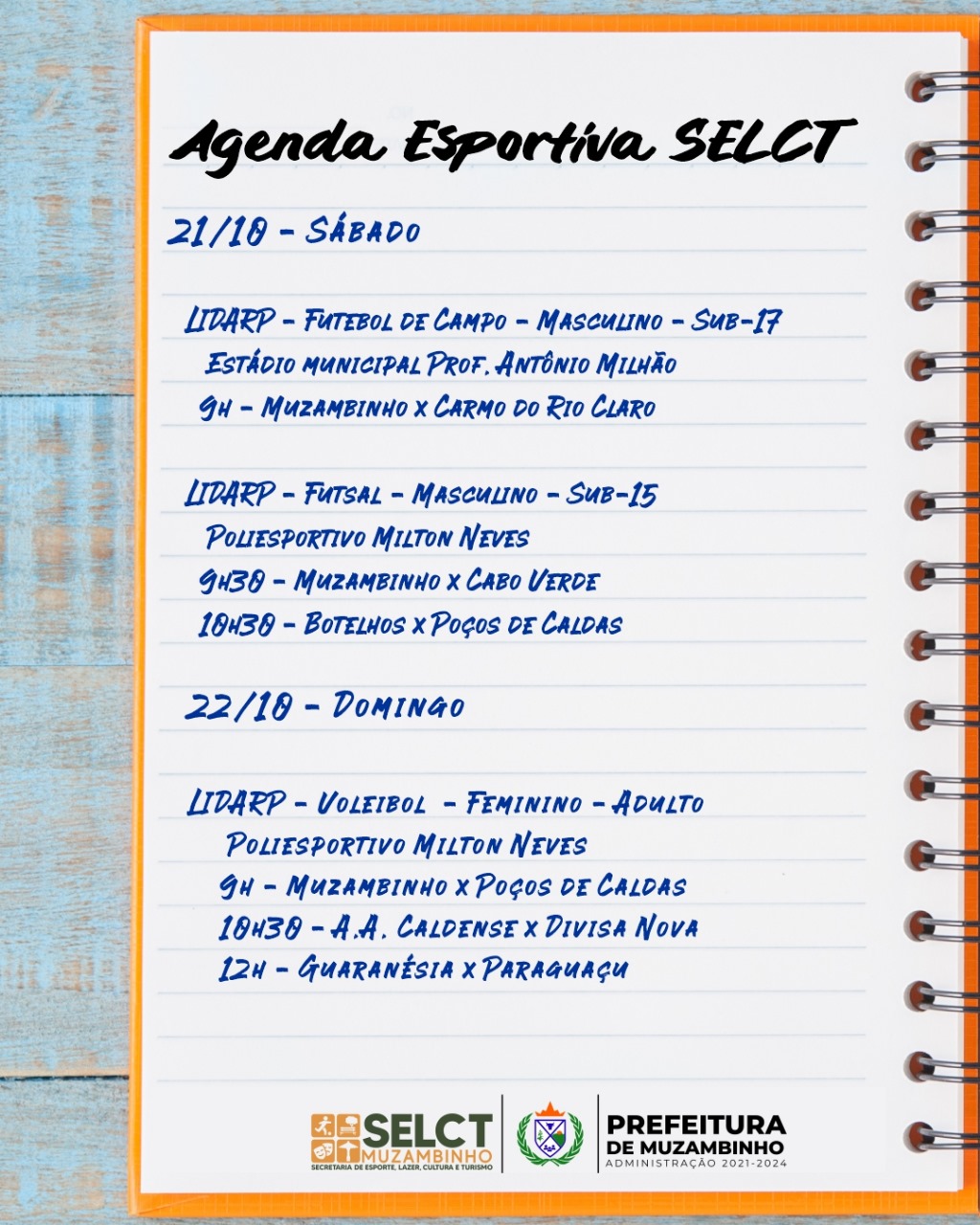 Neste fim de semana, Muzambinho recebe vários jogos da LIDARP – Liga Desportiva do Alto Rio Pardo. A Secretaria Municipal de Esportes, Lazer, Cultura e Turismo convida você para torcer por nossa cidade!