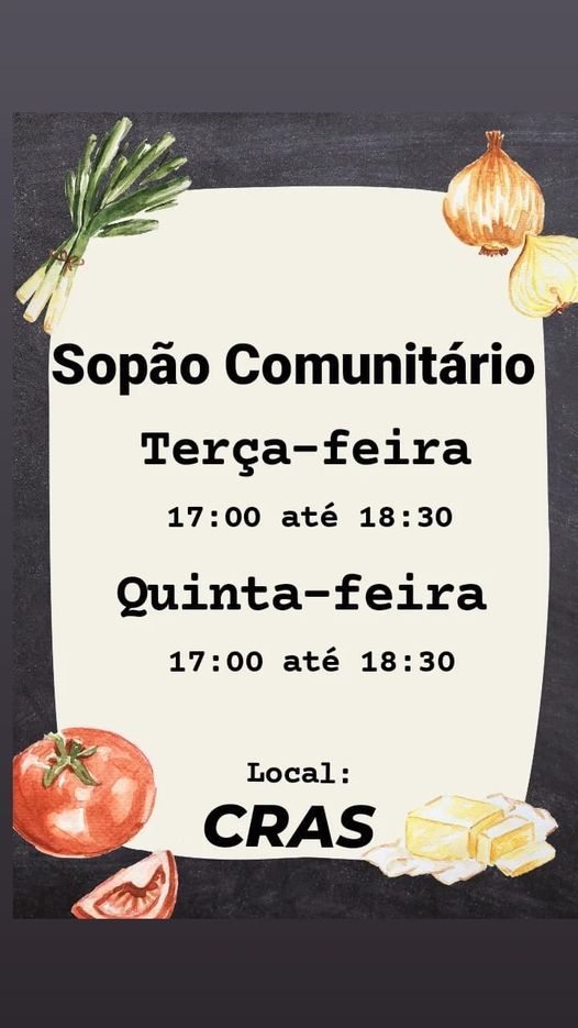 O Sopão é servido toda terça-feira e quinta-feira, das 17 às 18:30 horas, no CRAS – Centro de Referência de Assistência Social. A retirada das fichas é na Secretaria da Assistência Social.