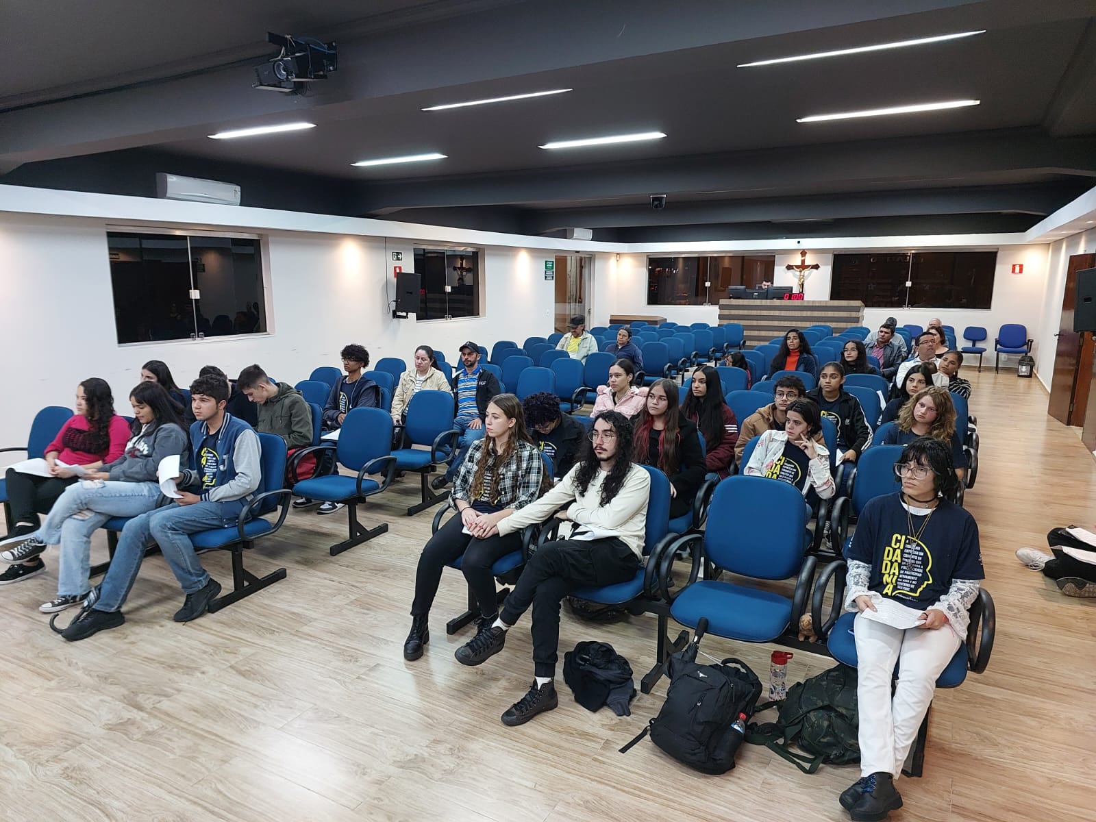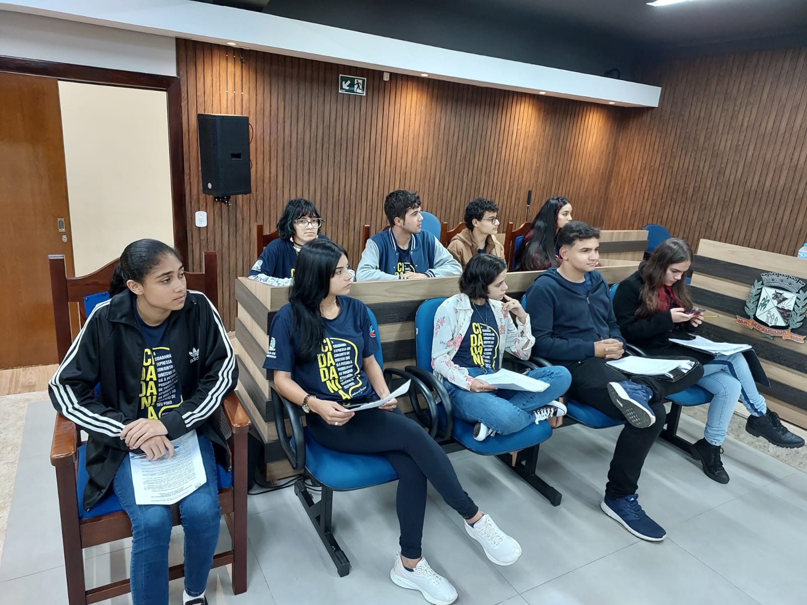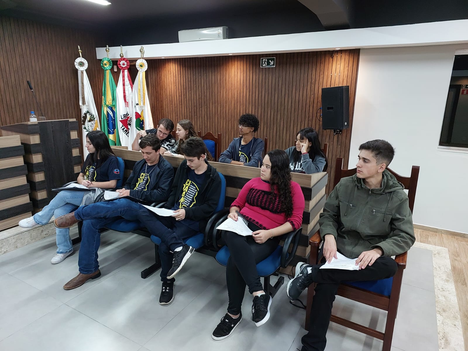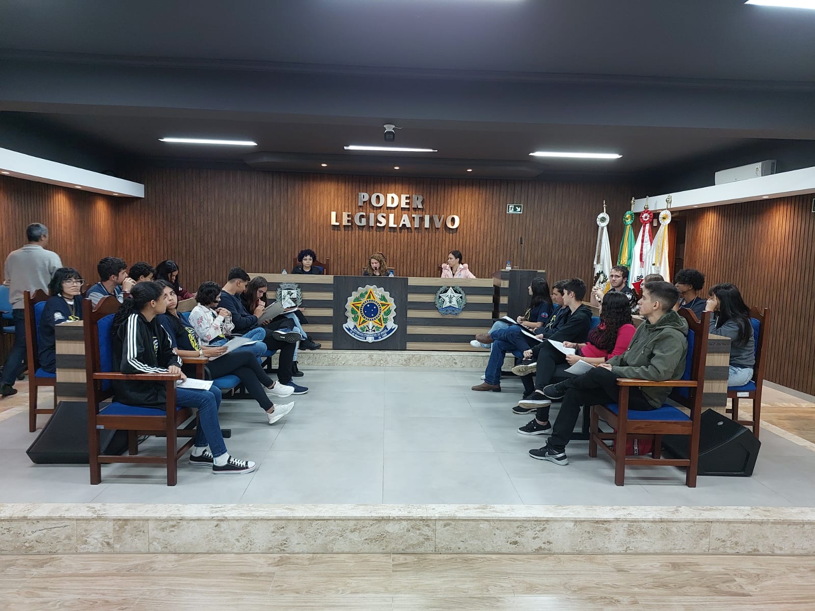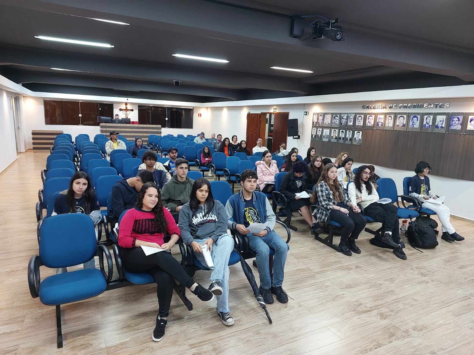 Os estudantes do ensino médio da Escola Estadual Professor Salatiel de Almeida e do IFSULDEMINAS CAMPUS MUZAMBINHO, que fazem parte do projeto, estão juntos há 4 meses, com oficinas semanais orientadas pelos servidores da Câmara Municipal. Passaram por oficinas de formação politica e cidadã e também por oficinas temáticas, que contaram com as contribuições dos professores do Campus Muzambinho: Prof: Evane e Professora Laura, assim como o Prof: Ricardo do Inatel de Santa Rita do Sapucaí. Durante esses meses, outros municípios participaram conosco de algumas oficinas, como Cabo Verde, Juruaia e Carmo do Rio Claro. No mês de maio, esses jovens parlamentares de Muzambinho, participaram em Poços de Caldas do Encontro Regional do Parlamento Jovem, juntamente com mais 400 jovens da nossa região que também estão envolvidos nesse projeto de formação política e cidadã. E hoje, nós estamos aqui para prestigiá-los na Plenária, para ouvirmos as propostas elaboradas por eles. Propostas que já foram discutidas, alteradas e muito debatidas nos Grupos de Trabalho entre eles, na semana passada.