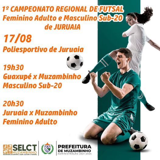 Nesta quinta-feira, 17/08, tem início o 1º Campeonato Regional de Futsal Feminino Adulto e Masculino Sub-20 de Juruaia. O evento é realizado pela Prefeitura Municipal de Juruaia, através da Secretaria Municipal de Educação, Cultura e Esporte do município e conta com a participação de oito cidades da região, incluindo Muzambinho, e será realizado no Poliesportivo da cidade.