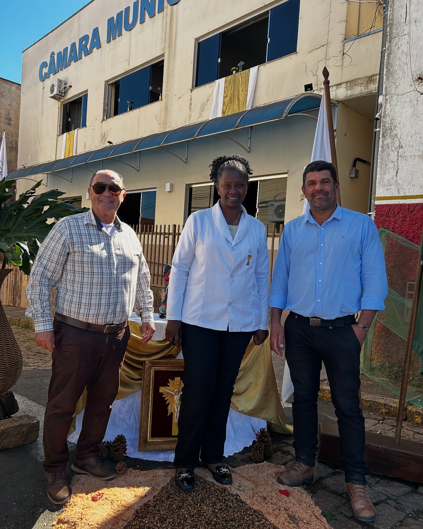 Na manhã desta quinta-feira (19), a Câmara Municipal foi agraciada com um momento de grande significado espiritual durante a tradicional procissão de Corpus Christi em Muzambinho. Fiéis se reuniram em frente ao prédio do Legislativo para participar da bênção do Santíssimo Sacramento, que marcou uma das paradas solenes do cortejo religioso pelas ruas da cidade.