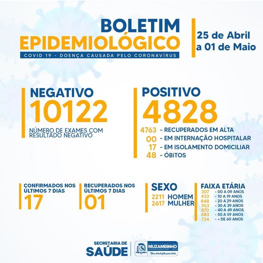 No período de 25 de Abril a 01 de Maio, confirmamos o resultado positivo para Covid-19 de Dezessete pacientes em Muzambinho, sendo 07 do sexo masculino e 10 do sexo feminino.