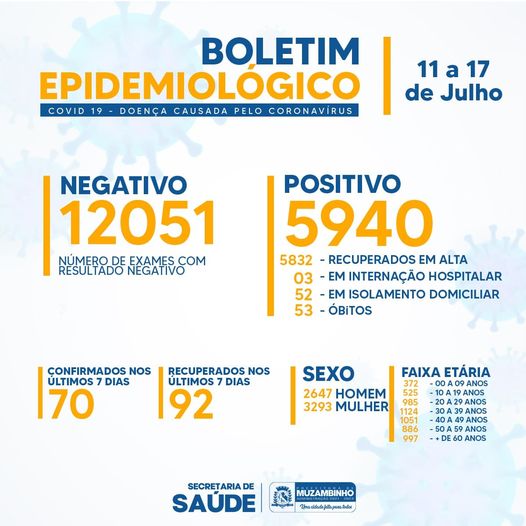 Conforme o Boletim Semanal da COVID-19 divulgado pela administração municipal nas redes sociais, no período de 11 a 17 de Julho, foi confirmado o resultado positivo para Covid-19 de Setenta pacientes em Muzambinho, sendo 25 do sexo masculino e 45 do sexo feminino.