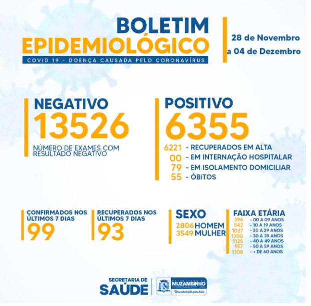 Os números foram divulgados pelo Gabinete de Crise Municipal no Combate à COVID-19 e se referem ao período de 8 de novembro a 4 de dezembro. Deste total, são 36 pessoas do sexo masculino e 63 do sexo feminino.