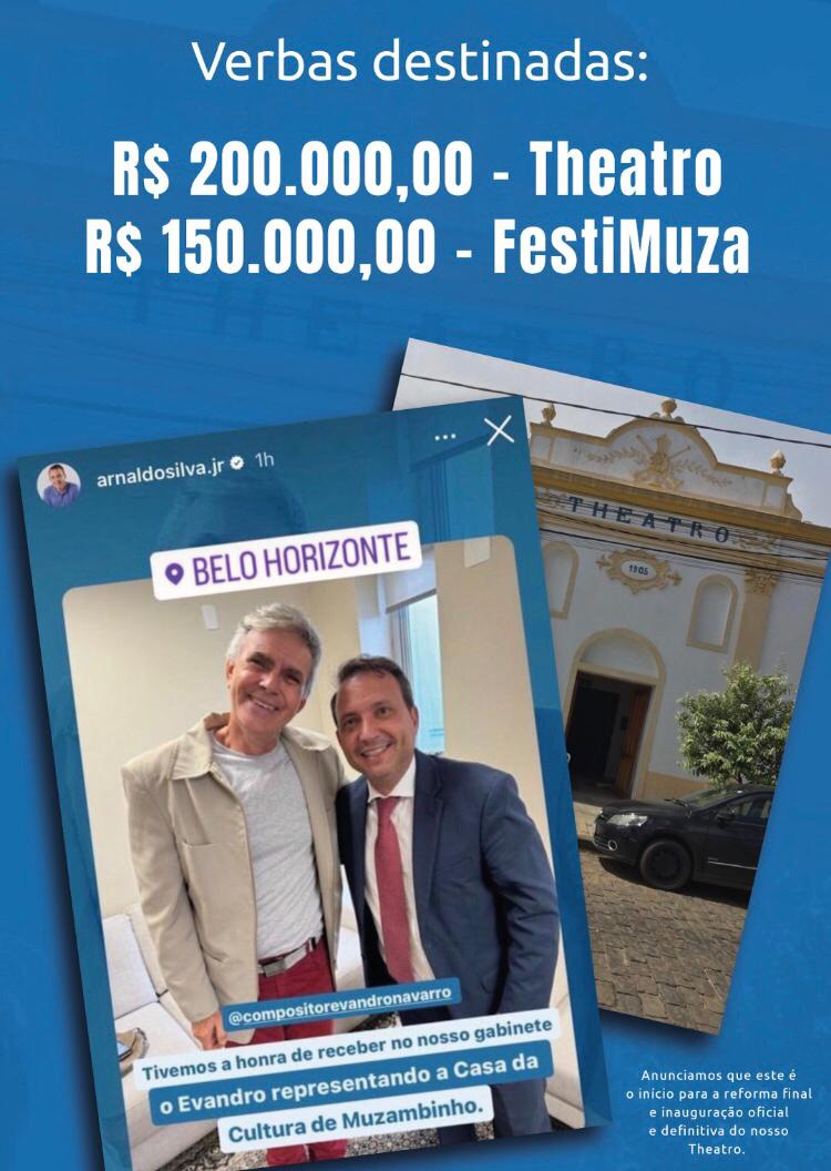 Evandro, levando o nome da SELCT – Secretaria Municipal de Esportes, Lazer, Cultura e Turismo, Prefeitura e de Muzambinho como um todo, esteve, em fevereiro último, em Belo Horizonte com o Deputado Arnaldo Silva, que prontamente se dispôs a intervir pela verba solicitada, em prol do Theatro e Festival de Música (FestiMuza). Em vinte dias veio a confirmação da vinda deste valor para os referidos fins.