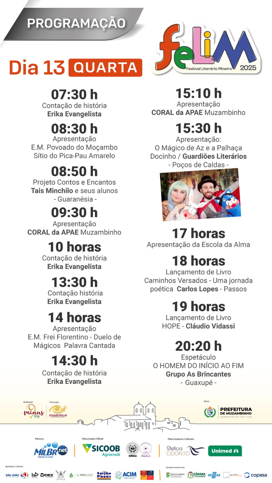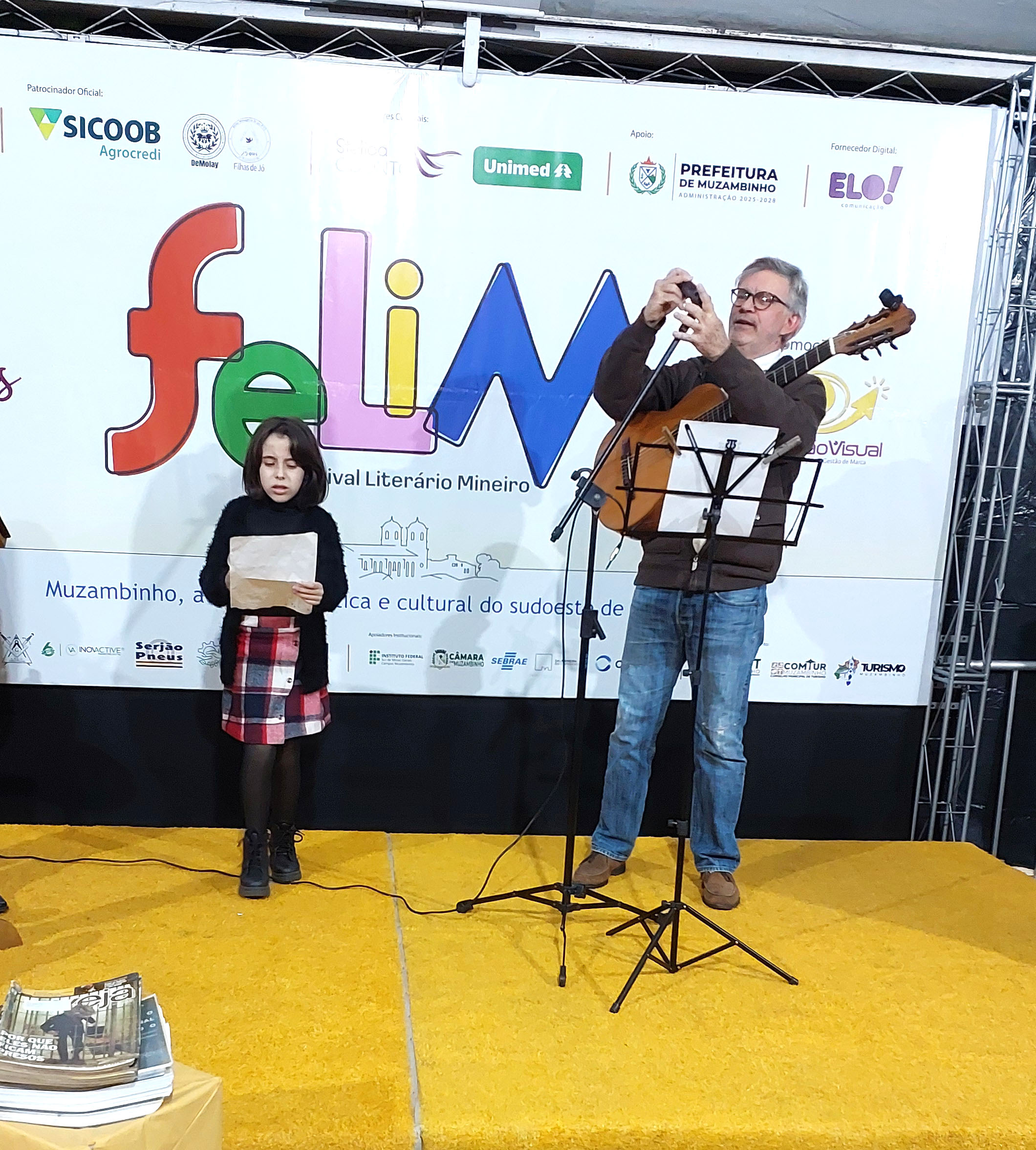 No final, Cidinha Mendes fez a leitura de um texto enviado pela madrinha do Felim, a educadora e escritora Gláucia Maria Vasconcellos Vale. Os músicos Tunico e Prof. José Marcos também contribuíram com apresentação musical durante a solenidade de abertura oficial do FELIM 2025.