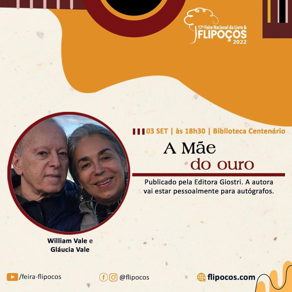 O livro, A Mãe do Ouro, de Gláucia Maria Vasconcellos Vale, em coautoria com seu marido, Willian Vale, uma saga épica sobre raízes da mineiridade, integrará a agenda oficial do Festival Literário Internacional de Poços de Caldas/ FLIPOÇOS e será lançado no dia 03/ setembro, na Biblioteca Centenário. No período de realização do evento, de 03 a 11 de setembro, a Academia Mineira de Letras fará uma transferência simbólica de sua sede de Belo Horizonte para a cidade de Poços de Caldas, que deverá receber cerca de 80 mil visitantes nacionais e internacionais.