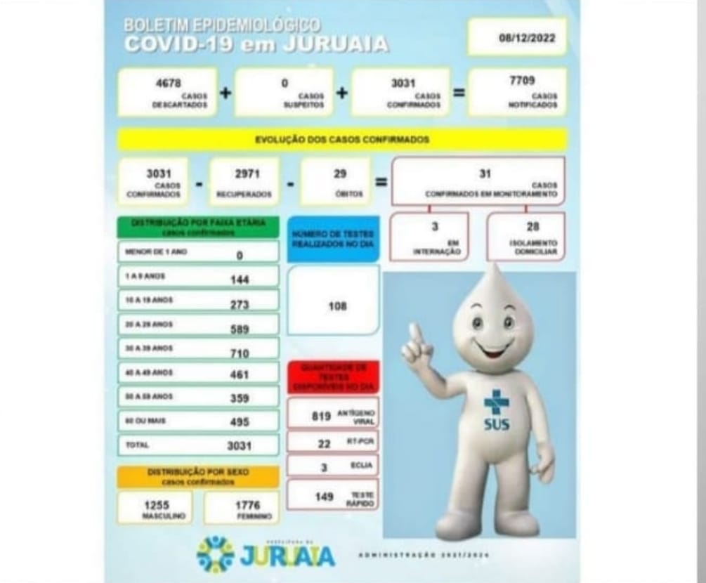 Assim, Juruaia totaliza 3.031 casos positivos, sendo 2.971 recuperados/alta médica, com 28 pacientes em isolamento domiciliar, com registro de 03 paciente em isolamento hospitalar e 29 óbitos confirmados COVID-19.