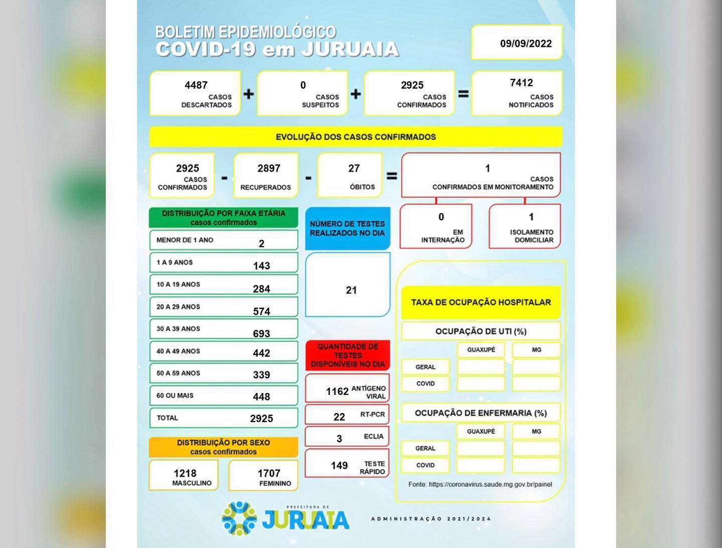 Assim, Juruaia totaliza 2.925 casos positivos, sendo 2.897 recuperados/alta médica, com 01 paciente em isolamento domiciliar, sem registro de pacientes em isolamento hospitalar e 27 óbitos confirmados COVID-19.