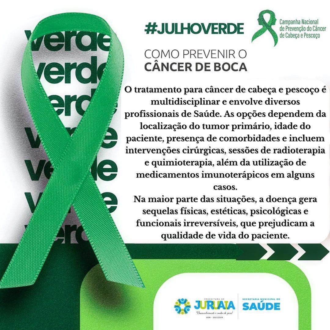 A campanha Julho Verde promove a conscientização e chama a atenção para a prevenção e o tratamento de tumores de cabeça e pescoço. O Dia Mundial de Conscientização e Combate a esses tipos de cânceres é celebrado no dia 27 deste mês.