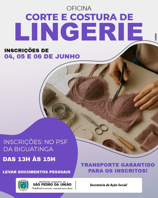 A Prefeitura Municipal de São Pedro da União vai realizar uma Oficina de Corte e Costura em Lingerie para os munícipes do Distrito da Biguatinga e bairros do distrito!