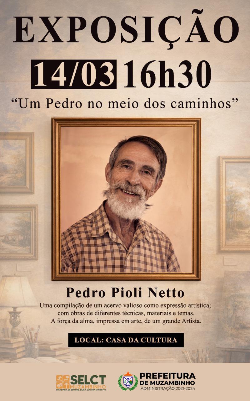 A Casa da Cultura (SELCT – Secretaria Municipal de Esportes, Lazer, Cultura e Turismo) – Prefeitura de Muzambinho, convida para a abertura da Exposição “Um Pedro no meio dos Caminhos”. Mostra de obras do saudoso artista, multifacetado, Pedro Pioli Netto.