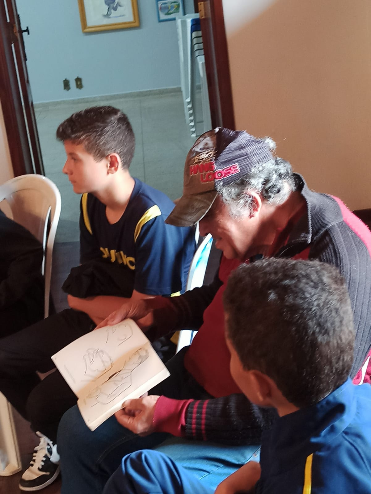 Alguns álbuns, com charges, foram passados no grande círculo em que se dispuseram. Paulo deu algumas dicas sobre como fazer desenho e explicou sobre o seu processo criativo.